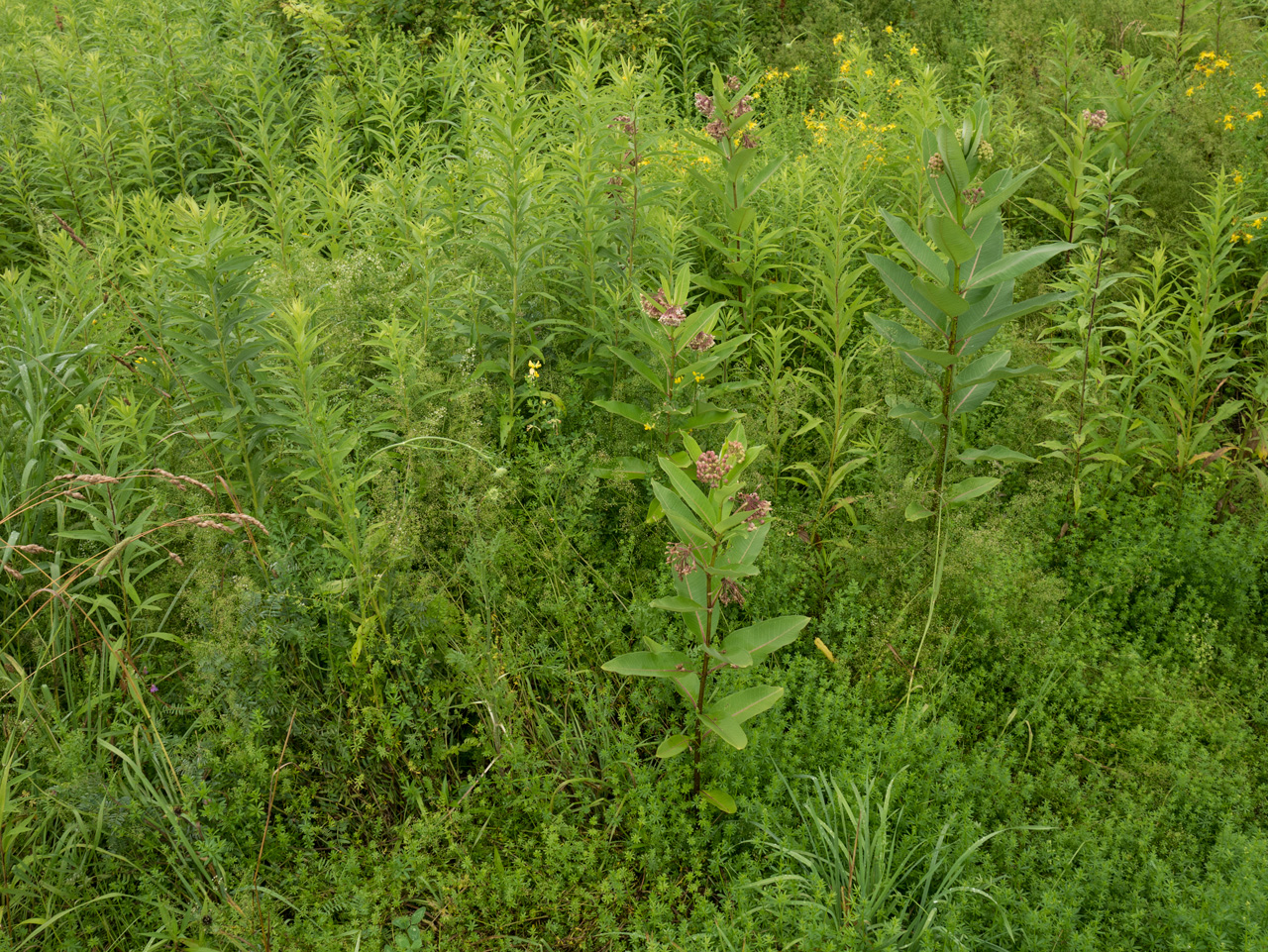 Corn and hay. Plenty of weeds at the edge of the side road to New Boston. These are probably feeder crops, and the cash crop is likely beef cattle, grazing somewhere else further from state route 22. They'll be getting the hay and corn later. It was fascinating to watch the tractor scooping up the harrowed hay and shooting it into the big straight body trucks (there were three of those trucks working in rotation, driving the loads back down south on 22). The equipment is old. I didn't get a close look at the combine, but the trucks were in the 20-40 year-old range, putting a lot of diesel particulate into the air as they strained out of the valley onto the highway. The precision with which the trucks held position with the output of hay was a little amazing. Maybe they were using GPS and cameras mounted on the spray arm, feeding back into the control cabins—or maybe these guys have just been doing it this way for decades, and know how to get it right.